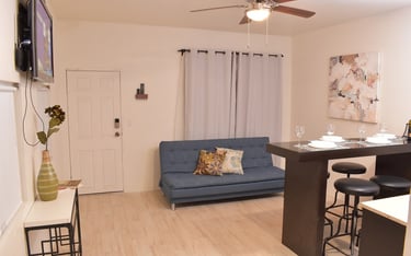 "Cada departamento cuenta con una habitación elegantemente presentada y ofrecemos un servicio de limpieza dos veces por semana para asegurar que regreses a un espacio siempre impecable y acogedor."